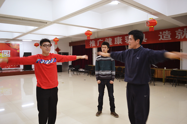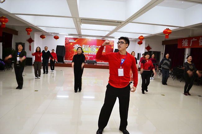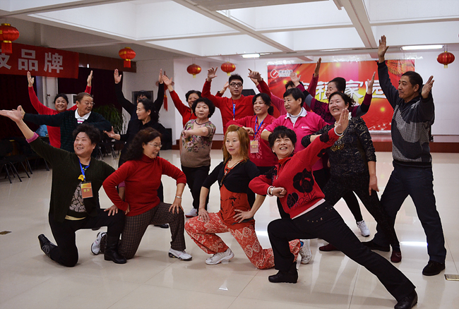最早趕到康姿百德公司排練場地的是16位伴舞人員,都是50歲以上的中老年人。她們從早晨8點半開始便投入了一遍又遍地排練。每排練一遍,舞蹈老師都會進行細微的糾正、調(diào)整隊形和調(diào)動情緒。每位健身操隊員也沒有因為反復(fù)的走位表現(xiàn)出疲憊或煩躁,始終面帶笑容,激情勃勃的投入排練。因為投入的運動量非常大,很多人都是滿頭大汗,演員們就索性脫下厚實的棉衣輕裝上陣。