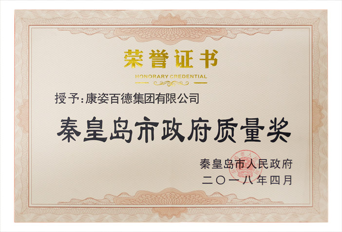 “秦皇島市政府質(zhì)量獎”證書