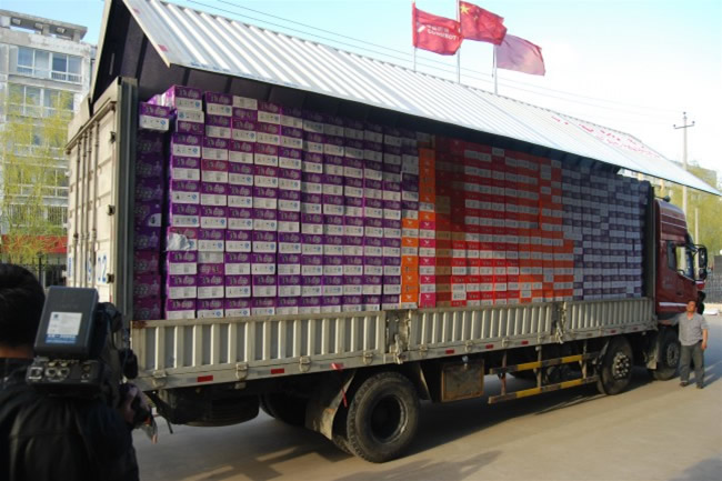 25日上午9點(diǎn),物資車(chē)到達(dá)石家莊。石家莊康姿百德總代理李志華,代表新華區(qū)、裕華區(qū)、橋西區(qū)、橋東區(qū)、長(zhǎng)安區(qū)、開(kāi)發(fā)區(qū)、辛集市、平山縣、藁城縣、正定縣等地的代理商將愛(ài)心物資裝上貨車(chē)