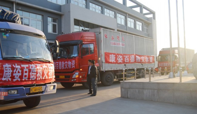滿(mǎn)救災(zāi)物資的貨車(chē)離開(kāi)康姿百德公司,駛向?yàn)?zāi)區(qū) “捎去我的愛(ài)心,帶上我的祝?!?/strong> “回饋社會(huì),造福人類(lèi)”,始終是康姿百德公司秉承的經(jīng)營(yíng)理念。全國(guó)各地的康姿百德經(jīng)銷(xiāo)商在把幸福和健康帶給人們的同時(shí),也深知自己身上的責(zé)任,不忘奉獻(xiàn)自己的愛(ài)心。他們積極捐款捐物,向?yàn)?zāi)區(qū)人民伸出援助之手。物資車(chē)途經(jīng)北京、河北、山西、河南等地時(shí),當(dāng)?shù)亟?jīng)銷(xiāo)商囑咐司機(jī)一定把這份愛(ài)心物資安全送到災(zāi)區(qū), “捎去我的愛(ài)心,帶上我的祝?!?,這是康姿百德人最強(qiáng)烈的心聲。