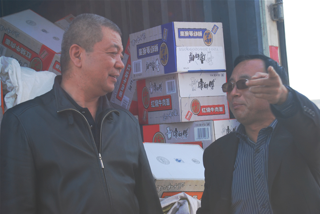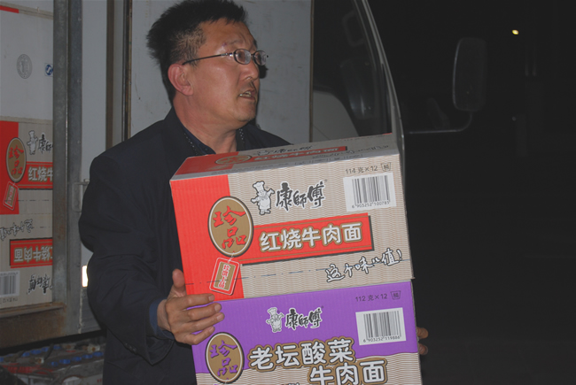 方便面、棉被、衣服等救災(zāi)物資載滿(mǎn)整個(gè)貨車(chē)