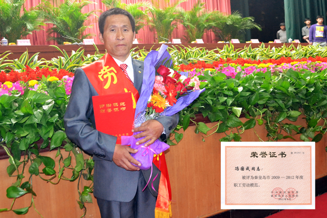 2012年4月24日,秦皇島市2009—2012年度市級(jí)勞動(dòng)模范表彰暨慶?!拔逡弧眹H勞動(dòng)節(jié)大會(huì)在秦皇島工人文化宮隆重召開??底税俚鹿局圃旌笄诓繖C(jī)電主管馮國成同志被授予“秦皇島市2009-2012年度職工勞動(dòng)模范”榮譽(yù)稱號(hào),并受到了秦皇島市市委、市政府各級(jí)領(lǐng)導(dǎo)的親切接見。