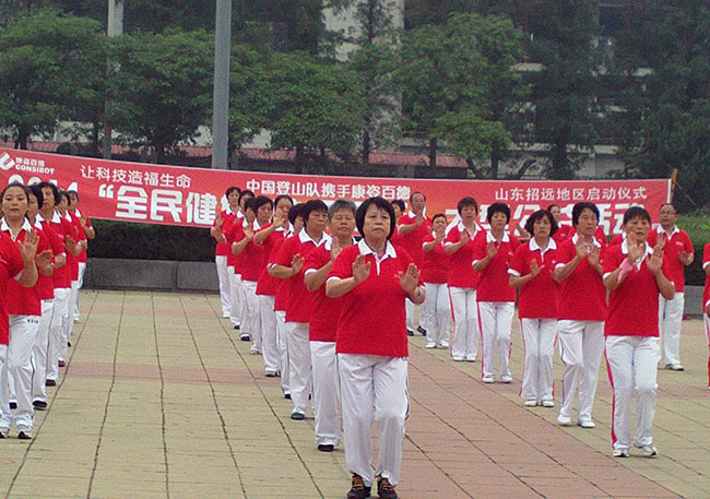 8月8日,山東招遠的700多名康姿百德健身操愛好者和當?shù)厥忻瘢谑姓畯V場載歌載舞,喜迎“全民健身日”,向人們倡導(dǎo)康姿百德公司提出的“健康睡眠+適量運動+合理飲食”的立體健康理念,傳遞著健康向上的正能量。 當天上午8:30分,由當?shù)乜底税俚聭敉饨∩頎I組織舉辦的2014“全民健身 快樂同行”大型公益活動招遠地區(qū)啟動儀式在這里隆重舉行,招遠經(jīng)銷商向廣大市民宣布了本次活動的目的和意義,當?shù)乜底税俚陆∩頎I隊員進行了健身操表演,贏得了在場觀眾的普遍贊賞。大家一致認為,康姿百德健身操節(jié)拍有力,動作到位,音樂優(yōu)美,具有適宜人群廣泛、簡單易學(xué)的特點,是市民健身鍛煉的好項目,今后要加入到這個健身隊伍中,為推廣全民健身貢獻力量。 本次活動得到了當?shù)赜嘘P(guān)部門和媒體的重視,招遠市老體協(xié)等單位領(lǐng)導(dǎo)出席了啟動儀式,招遠新聞對本次活動進行了報道。