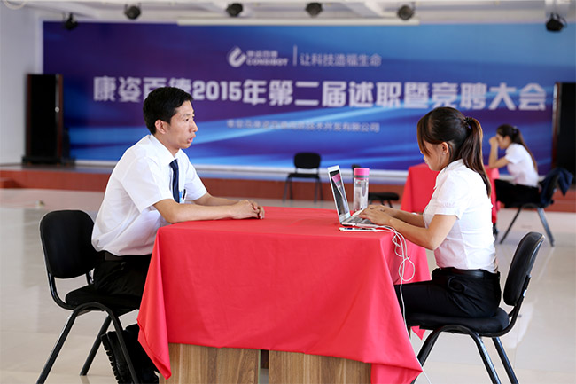 “我參加工作以來(lái)一直從事行政管理相關(guān)的工作,對(duì)公司日常行政管理工作有更深的理解,這個(gè)是我競(jìng)聘行政主管的優(yōu)勢(shì)……”7月2日,在康姿百德科技園辦公樓三樓會(huì)議室,參加康姿百德2015年第二屆述職暨競(jìng)聘大會(huì)的行政專員馮璐正在向評(píng)審團(tuán)進(jìn)行面試答辯。這也是此次競(jìng)聘大會(huì)最為重要的一個(gè)環(huán)節(jié)。