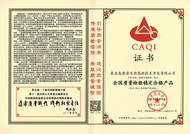 此外,康姿百德還分別榮獲3.15主題活動中“全國產(chǎn)品和服務(wù)質(zhì)量誠信示范企業(yè)”、“全國質(zhì)量檢驗穩(wěn)定合格產(chǎn)品”兩項榮譽。