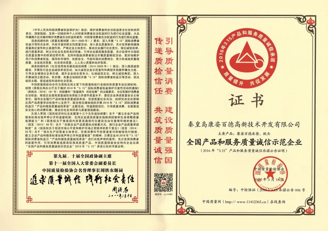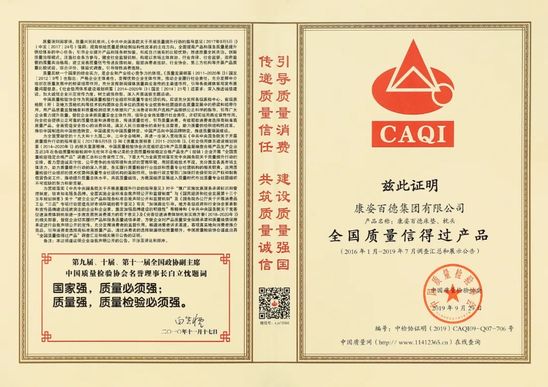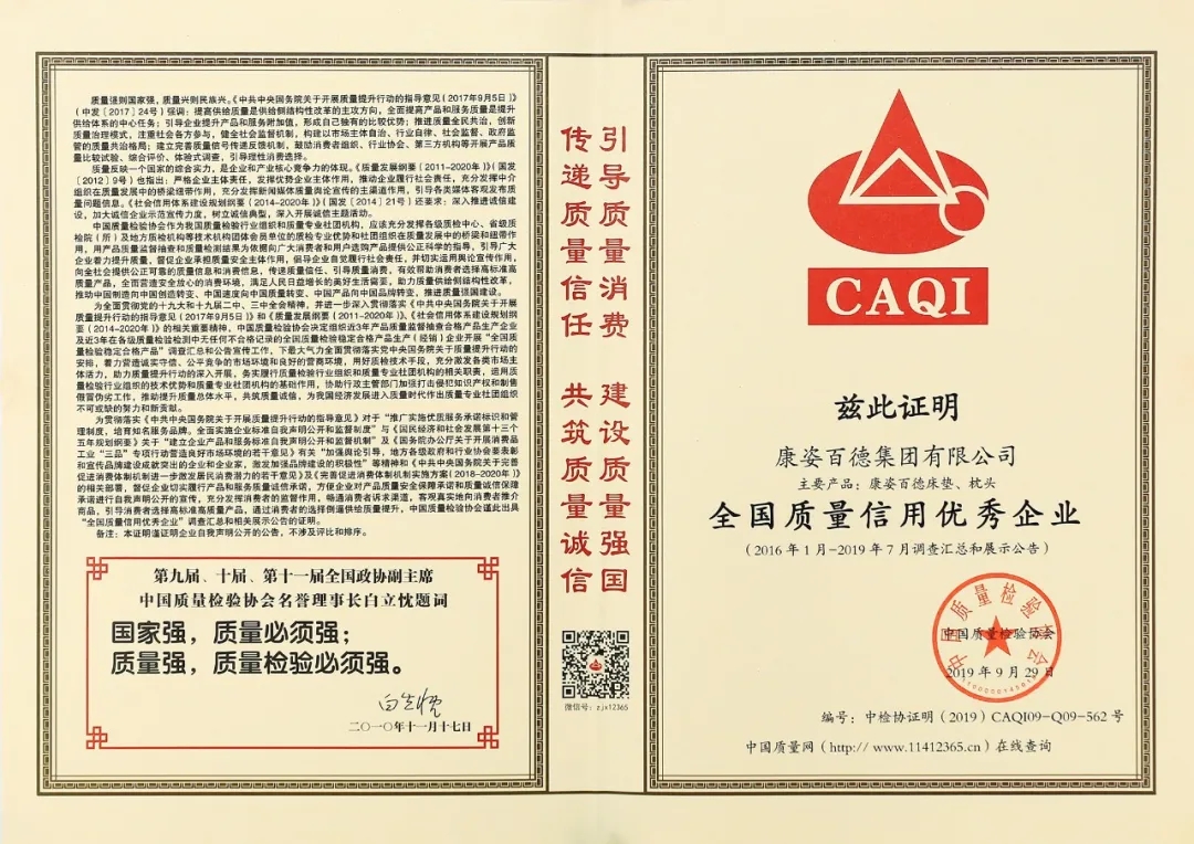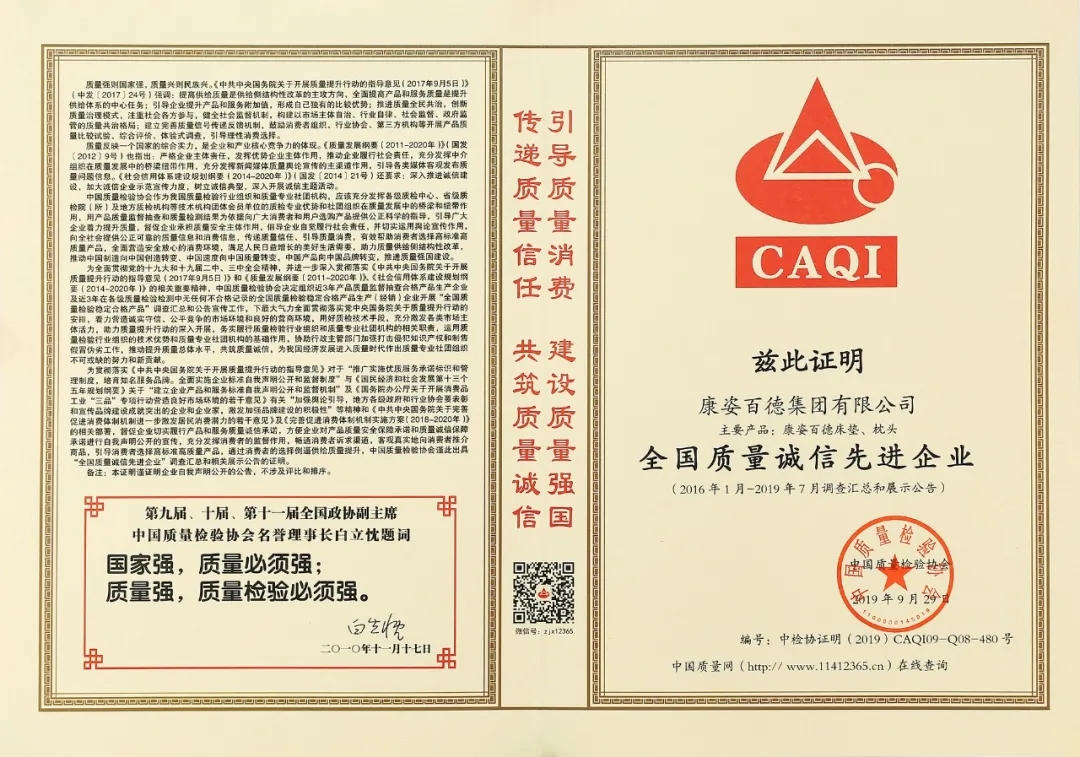 在李銀祥董事長的帶領(lǐng)下,康姿百德始終堅(jiān)持誠信經(jīng)營,并先后榮獲了”全國產(chǎn)品和服務(wù)質(zhì)量誠信示范企業(yè)“、“全國質(zhì)量信用優(yōu)秀企業(yè)”、”全國質(zhì)量誠信先進(jìn)企業(yè)”、“全國質(zhì)量信得過產(chǎn)品”等多項(xiàng)榮譽(yù)。
