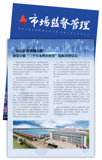 康姿百德在消費(fèi)者維權(quán)方面,積極響應(yīng)國家市場(chǎng)監(jiān)督管理總局的號(hào)召,自主在行業(yè)內(nèi)推行“三個(gè)月無理由退貨”政策,并被先后刊登在《市場(chǎng)監(jiān)督管理》雜志上3次。