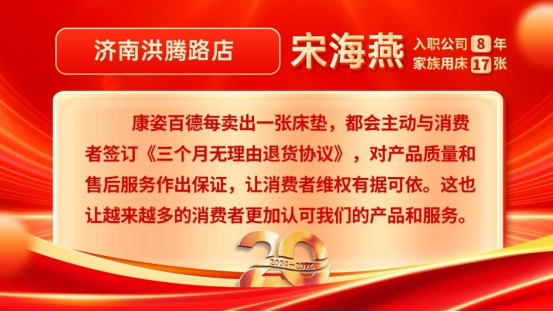 宋海燕表示,因?yàn)樵诳底税俚逻@樣一個(gè)講誠信、負(fù)責(zé)任的企業(yè)工作,讓廣大消費(fèi)者都更加信任她,這讓宋海燕也非常自豪。她也表示,作為康姿百德的一員,今后,會(huì)以更加飽滿的熱情和責(zé)任心,全心全意地服務(wù)好每一位客戶,讓大家都能感受到她的真心和誠意。