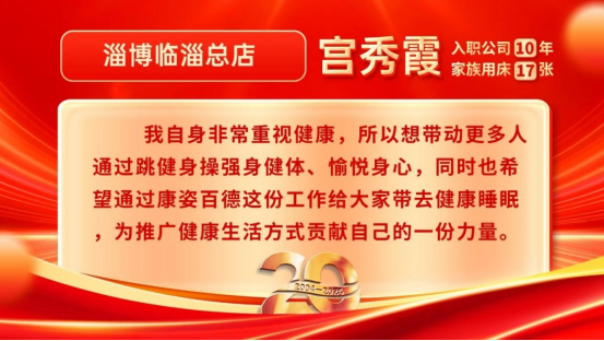 宮秀霞因康姿百德健身操與康姿百德結(jié)緣,入職后,了解到康姿百德是一家有社會(huì)責(zé)任感的公司,一直用實(shí)際行動(dòng)推動(dòng)著“健康中國”建設(shè)。