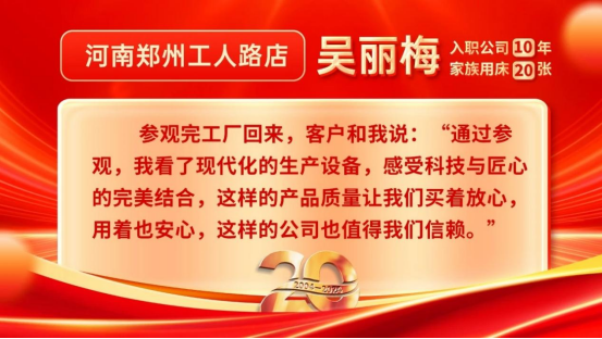今年是康姿百德集團成立20周年。在20年的發(fā)展歷程中,有這樣一群人,他們在市場經(jīng)營管理過程中,深刻貫徹以客戶為中心的理念,始終把優(yōu)質(zhì)的服務(wù)融于門店經(jīng)營的每個環(huán)節(jié),也因此得到了客戶的贊賞和認(rèn)可。他們就是康姿百德專賣店的員工。本期和您分享的是康姿百德河南地區(qū)和福建地區(qū)專賣店員工代表的故事。