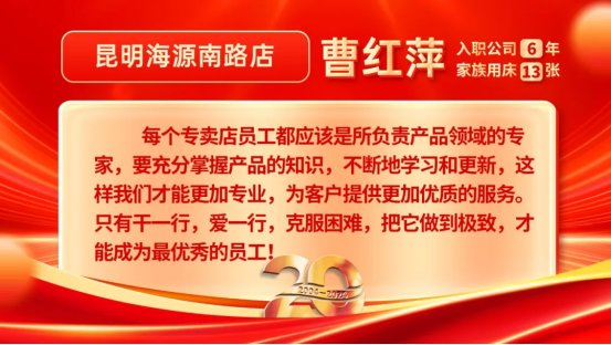 今年是康姿百德集團(tuán)成立20周年。在20年的發(fā)展歷程中,有這樣一群人,他們?cè)谑袌?chǎng)經(jīng)營(yíng)管理過(guò)程中,深刻貫徹以客戶(hù)為中心的理念,始終把優(yōu)質(zhì)的服務(wù)融于門(mén)店經(jīng)營(yíng)的每個(gè)環(huán)節(jié),也因此得到了客戶(hù)的贊賞和認(rèn)可。他們就是康姿百德專(zhuān)賣(mài)店的員工。本期和您分享的是康姿百德云南地區(qū)和廣東地區(qū)專(zhuān)賣(mài)店員工代表的故事。