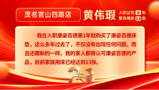 黃偉瑕說(shuō)道:“我在入職康姿百德第1年就購(gòu)買(mǎi)了康姿百德床墊,這么多年過(guò)去了,不僅沒(méi)有出現(xiàn)任何問(wèn)題,而且還跟新的一樣。我的家人都很認(rèn)可康姿百德的產(chǎn)品,目前家族用床已經(jīng)達(dá)到13張。我目前最大的愿望就是要讓更多消費(fèi)者知道康姿百德這個(gè)品牌,認(rèn)可康姿百德,讓康姿百德成為廣東茂名地區(qū)有影響力的寢具品牌。”