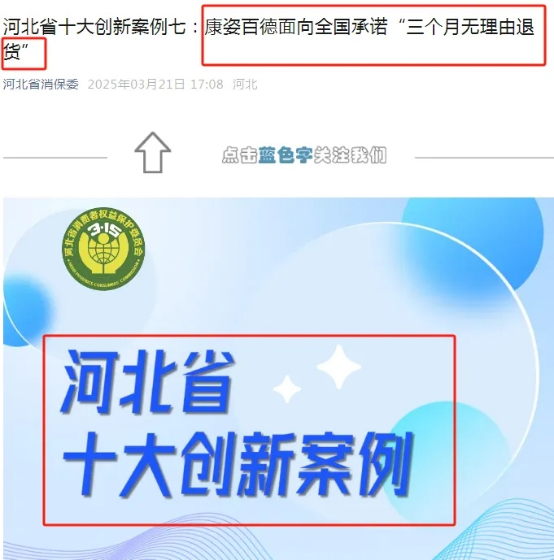 河北省消費者權益保護委員會還在其官方微信公眾號上,對康姿百德入選“河北省十大創(chuàng)新案例”進行了專題推送,將“三個月無理由退貨”作為典范向社會公開推廣。(原文鏈接請點擊:河北省十大創(chuàng)新案例七:康姿百德面向全國承諾“三個月無理由退貨”)