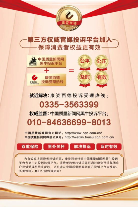 為了進一步提升專賣店的服務水平,更好地保護消費者的合法權益,康姿百德開通企業(yè)投訴受理熱線,加入了中國消費者協(xié)會“智慧315”消費維權投訴平臺,還特邀“中國質量新聞網(wǎng)黑牛投訴平臺”作為第三方投訴監(jiān)督平臺。并且,統(tǒng)一制作監(jiān)督舉報公示牌張貼在全國所有門店,主動接受消費者的監(jiān)督。多重途徑保障消費者的合法權益,真正做到投訴有渠道,事事有回音,件件有著落,讓廣大消費者購買無憂。