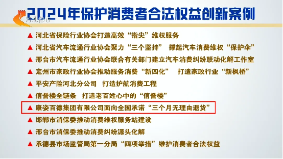 康姿百德面向全國承諾“三個月無理由退貨”還成功入選2024年保護消費者合法權益十大創(chuàng)新案例,并被河北省消費者保護委員會作為典范,向全社會推廣。