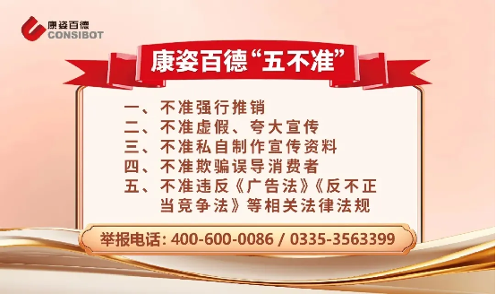 康姿百德不斷加大內部巡查力度,嚴格監(jiān)督市場人員的經營行為,要求各專賣店在醒目位置懸掛“五不準”宣傳標識,明令禁止有損消費者權益的行為,杜絕虛假宣傳,切實做到真誠待客,貨真價實、明碼標價。