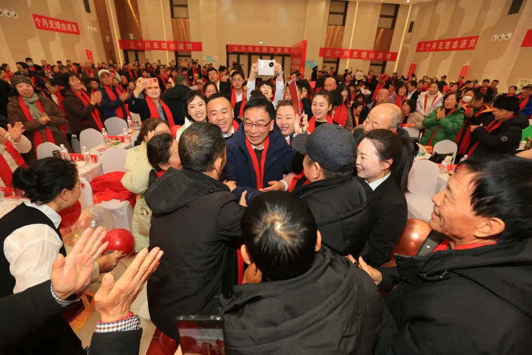 活動(dòng)現(xiàn)場(chǎng),銷售公司的領(lǐng)導(dǎo)們?cè)缫训群蛟诩t毯兩側(cè),笑容滿面地為每一位步入會(huì)場(chǎng)的“家人”親自系上象征吉祥與溫暖的紅圍巾??底税俚录瘓F(tuán)李銀祥董事長(zhǎng)的到來,更讓現(xiàn)場(chǎng)瞬間沸騰,客戶們紛紛揮手致意,掌聲與歡呼聲交織成一片,將慶典的喜悅氛圍點(diǎn)燃。